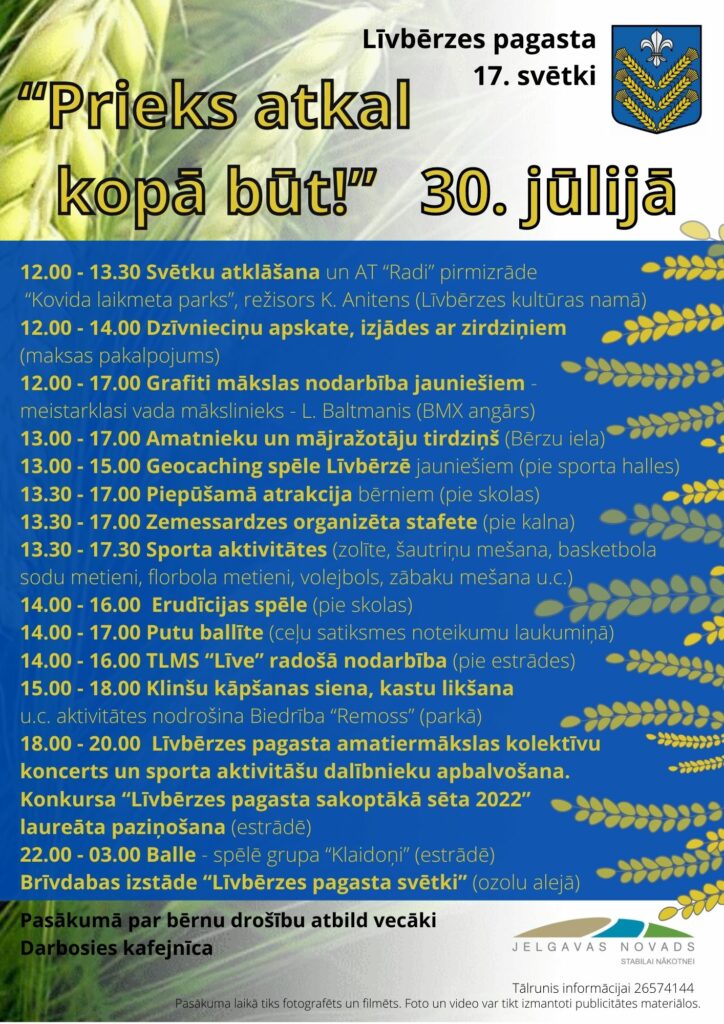 Svētku atklāšana – pulksten 12 pagasta kultūras namā, un dienas gaitā visi aicināti uz radošām nodarbībām un sportiskām aktivitātēm, kā arī uz amatnieku un mājražotāju tirdziņu. Svētki noslēgsies ar pagasta amatiermākslas kolektīvu koncertu, sporta aktivitāšu dalībnieku apbalvošanu, konkursa “Līvbērzes pagasta sakoptākā sēta 2022” laureāta paziņošanu un zaļumballi.