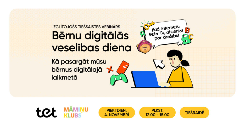 Lai palīdzētu vecākiem un pedagogiem rūpēties par bērnu drošību un veselību digitālajā vidē, tehnoloģiju uzņēmums “Tet” un TV raidījums vecākiem “Māmiņu klubs” sadarbībā ar speciālistiem rīko bērnu digitālās veselības dienu – tiešsaistes izglītojošu vebināru “Kā pasargāt mūsu bērnus digitālajā laikmetā”, kas norisināsies piektdien, 4. novembrī no pulksten 12.00 līdz pulksten 15.00 tiešsaistē. Pasākums ir daļa no sociālās iniciatīvas “Tet skoliņa bērniem”, kas aicina runāt ar jaunākajiem interneta lietotājiem par drošu un atbildīgu interneta lietošanu (www.digitaladrosiba.lv). Vebinārs pieejams bez maksas, un to būs iespējams vērot tiešraidē – Māmiņu kluba un “Tet””Facebook” lapā: https://fb.me/e/798xRrbhn.