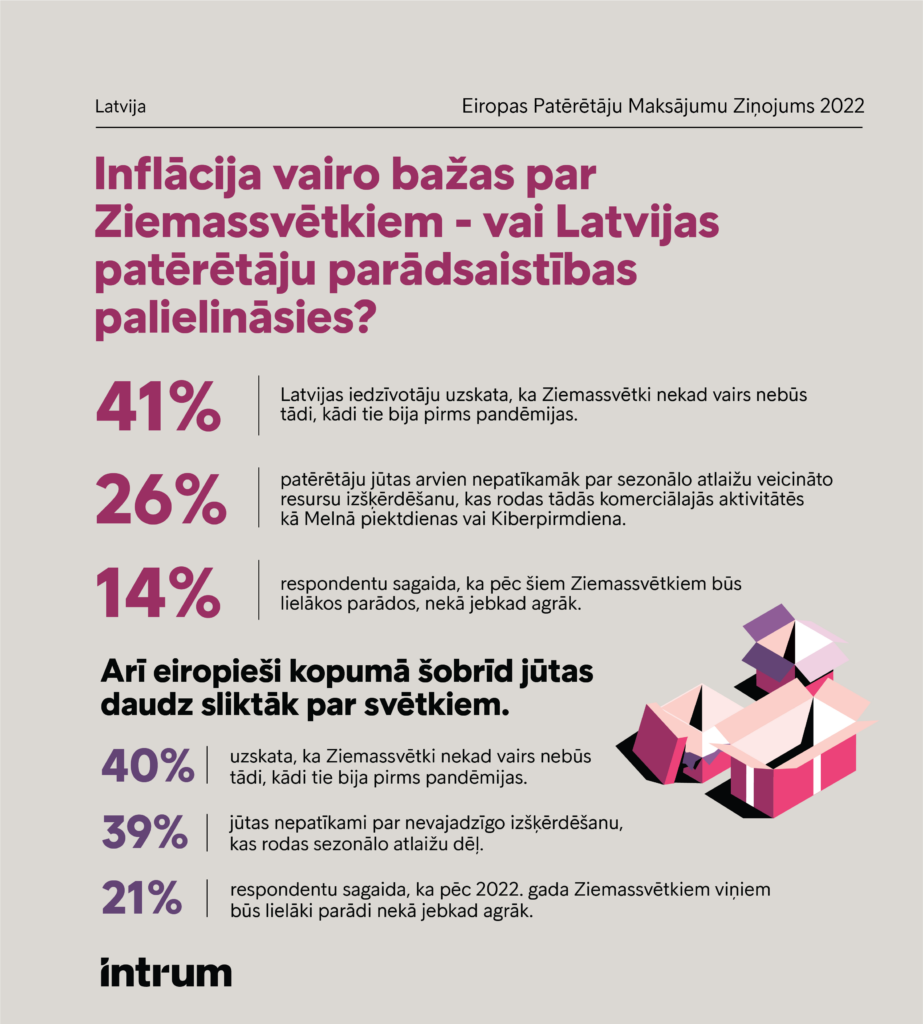 “Cilvēkus satrauc cenu kāpums, ģeopolitiskā neskaidrība un jaunu Covid-19 ierobežojumu iespējamība, tāpēc arī svētku laiks vairs nav tik gaidīts kā iepriekš. Kaut gan mēs esam ļoti atbildīgi patērētāji, Ziemassvētku laiks neatceļ visus pārējos maksājumus un finansiālās saistības, ko uzkrājam gada laikā. Dāvanas tuviniekiem, svētku maltītes izmaksas un citi ar svētku sezonu saistītie tēriņi rada papildus izdevumus un var ietekmēt regulāro rēķinu kavēšanu. Situācija, kad uzkrājas neapmaksāti rēķini, kas summējas ar nākamā mēneša regulārajiem maksājumiem, var radīt lieku stresu un grūti pārvaldāmas parādsaistības,” pauž “Intrum” ģenerāldirektore Baltijā Ilva Valeika.