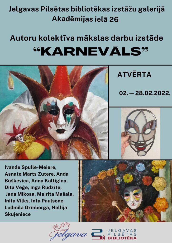 Jelgavas Pilsētas bibliotēkas izstāžu galerijā divpadsmit mākslinieču kolektīvs aicina apskatīt košu, krāsainu un dzīvespriecīgu izstādi “Karnevāls,”informē Jelgavas pašvaldības Sabiedrisko attiecību pārvaldē.