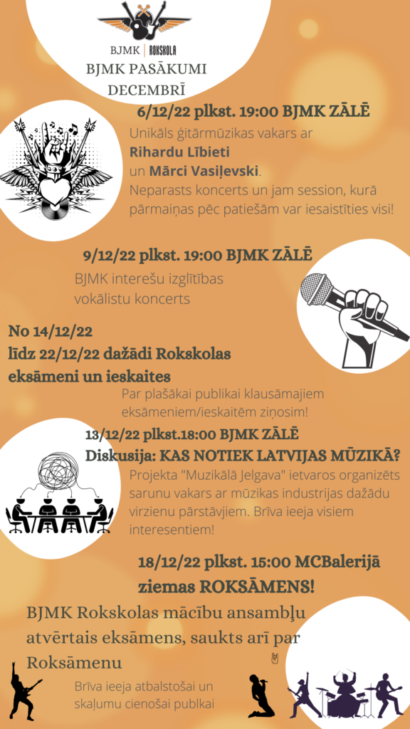 Projekta “Muzikālā Jelgava” gaitā ar Jelgavas valstspilsētas atbalstu decembrī BJMK telpās, Dobeles ielā 68 gaidāmi 2 pasākumi: