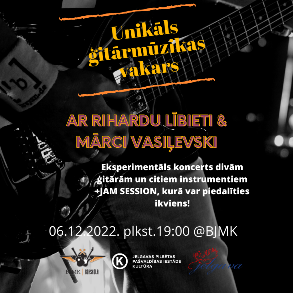 - 6. decembrī pulksten 19.00 “Unikāls ģitārmūzikas vakars” ar ģitāristiem Rihardu Lībieti un Mārci Vasiļevski. Pasākums divās daļās, no kurām pirmā- eksperimentāls koncerts divām ģitārām un citiem instrumentiem, bet otrajā daļā iespējams gan līdzdarboties, gan klausīties, kā notiek mūzikas improvizācijas sesija (JAM session).