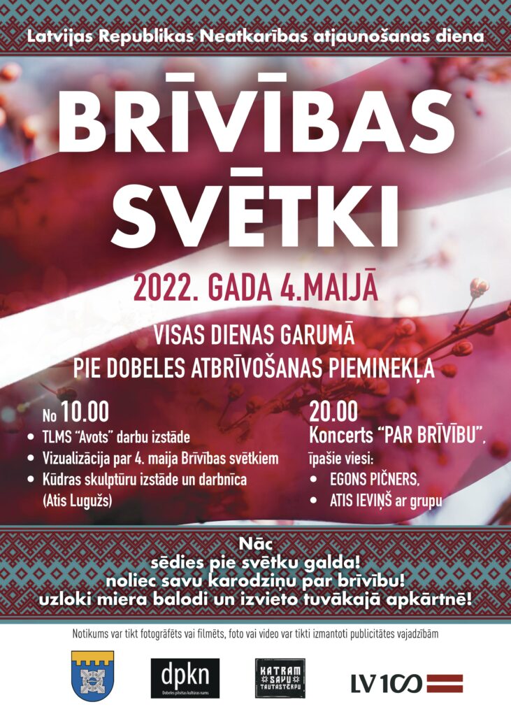 4. maijā visas dienas garumā pie Dobeles atbrīvošanas pieminekļa atzīmēs Latvijas Republikas Neatkarības atjaunošanas dienu. Svētku noslēgumā – koncerts “Par brīvību,” informē Dobeles pilsētas kultūras nama kultūras darba menedžere Madara Vinkelmane.