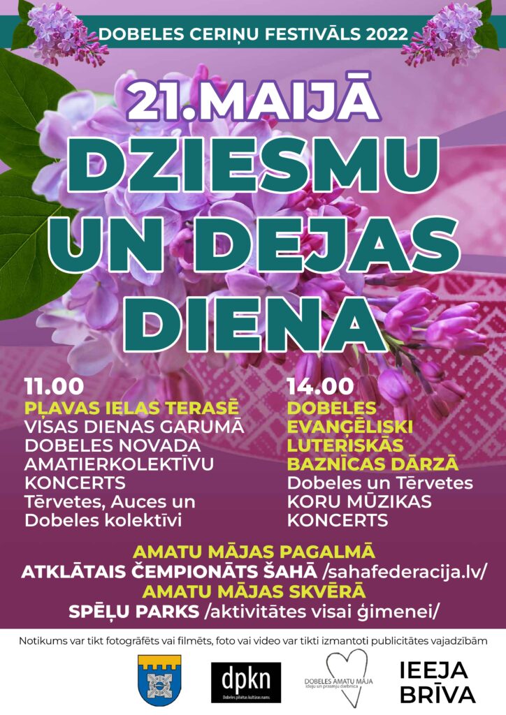 Iekļaujoties ceriņsvētku pasākumos, kas norisinās no 12. maija līdz 21. jūnijam, sestdien, 21. maijā, Dobelē pirmo reizi notiks Dziesmu un deju diena, informē pilsētas kultūras namā.