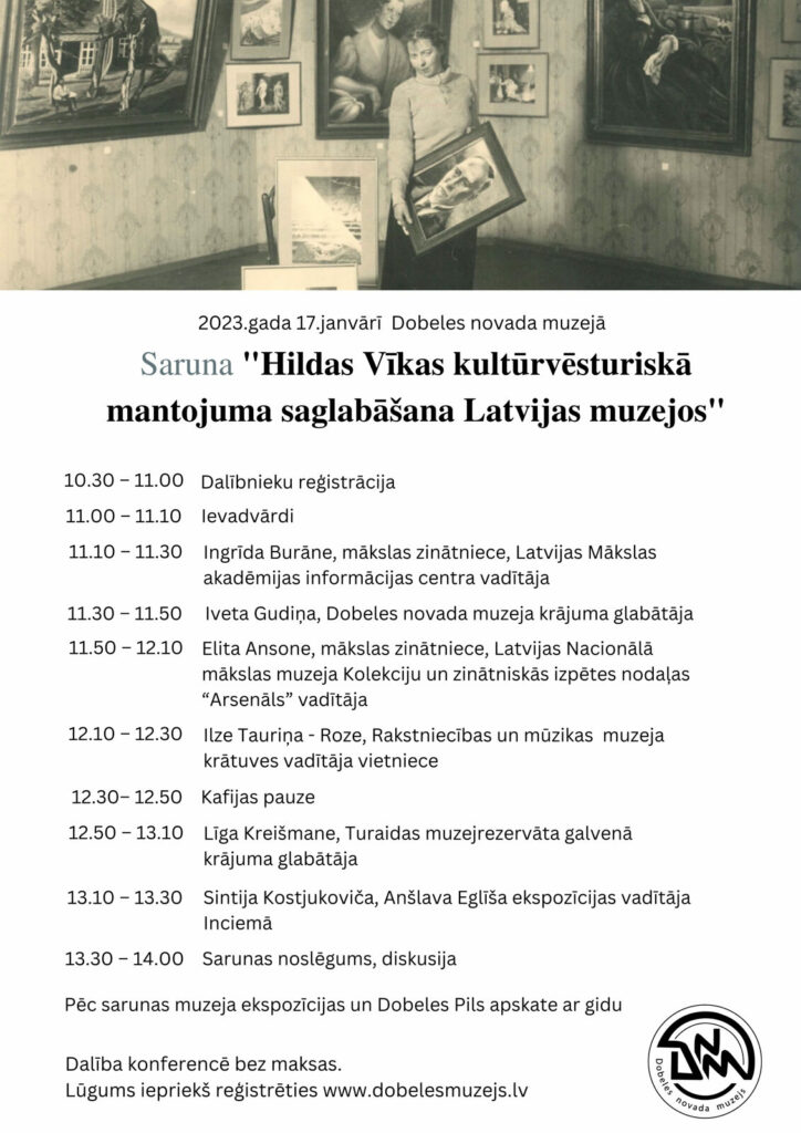 Dobeles novada muzejs aicina uz konferenci “Hildas Vīkas kultūrvēsturiskā mantojuma saglabāšana Latvijas muzejos” 17. janvārī pulksten 11.00 Dobeles novada muzejā, Brīvības ielā 7.