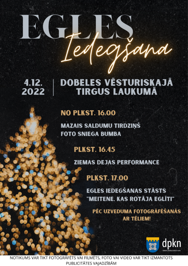 Svētdien, 4. decembrī Dobeles pilsētas kultūras nams aicina ikvienu uz Dobeles pilsētas egles iedegšanu, informē Dobeles pilsētas kultūras nama kultūras darba menedžere Madara Vinkelmane.