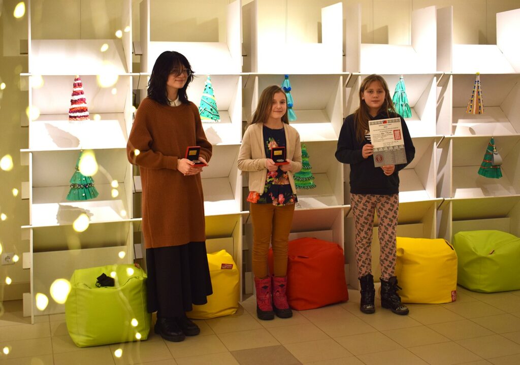 Ar sudraba medaļu novērtēts desmit gadus vecās Gabrielas Čulkstēnas (fotogrāfijā vidū) darbs “Two”, skolotāja Mārīte Jevstigņejeva, ar bronzas medaļu – desmit gadus vecās Marijas Ļvovas (pirmā no kreisās) darbs “Bring light into the dark depths”, skolotāja Kristīne Veinberga, bet Atzinības raksts piešķirts 13 gadus vecās Sofijas Tēraudas (pirmā no labās) darbam “Fly”(skolotāja M.Jevstigņejeva).