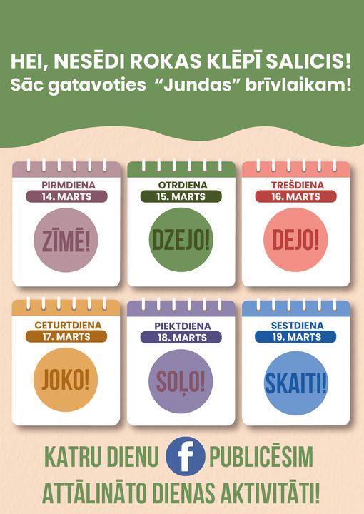 Katru dienu paredzēts kāds interesants uzdevums, kas tiks publicēts “Jundas” lapā sociālajā tīklā “Facebook”.