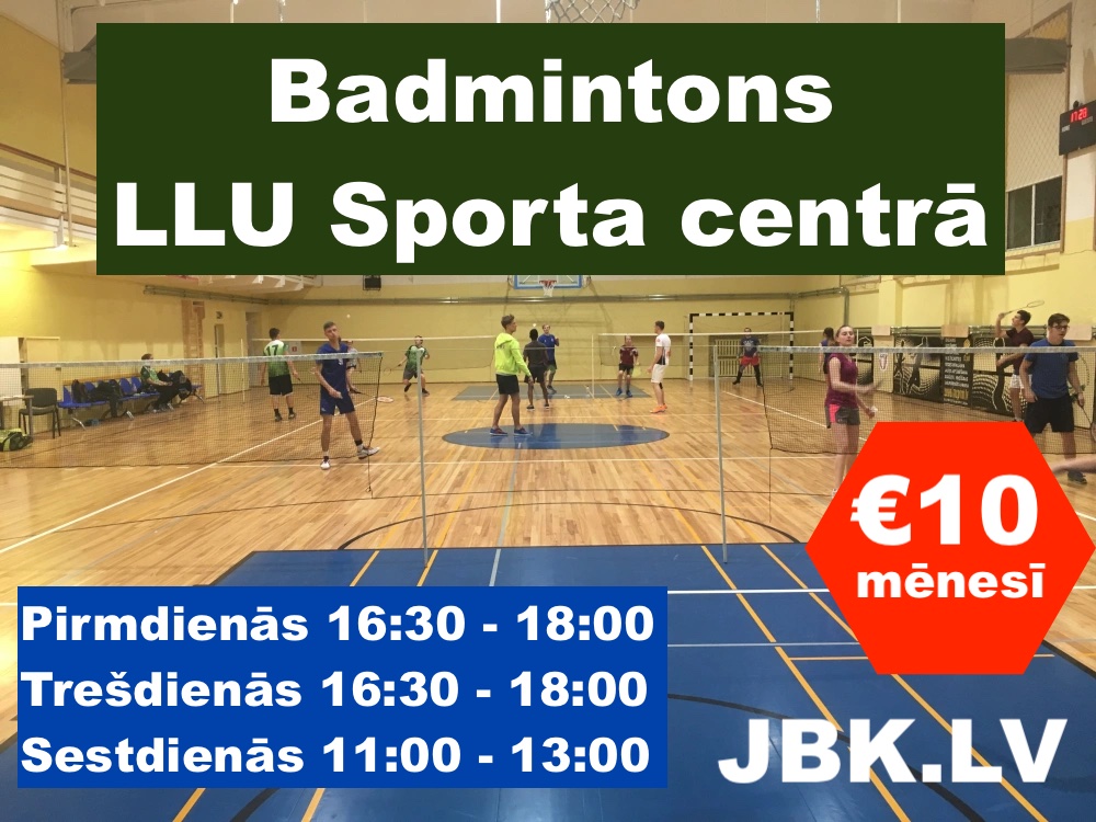 LLU Sporta centrā pirmdienās un trešdienās spēlētājiem ir pieejami četri badmintona dubultspēļu laukumi. Sestdienās ir pieejams arī piektais badmintona laukums mazajā zālē, gadījumā, ja tā tobrīd nav izīrēta citam treniņam vai pasākumam.
