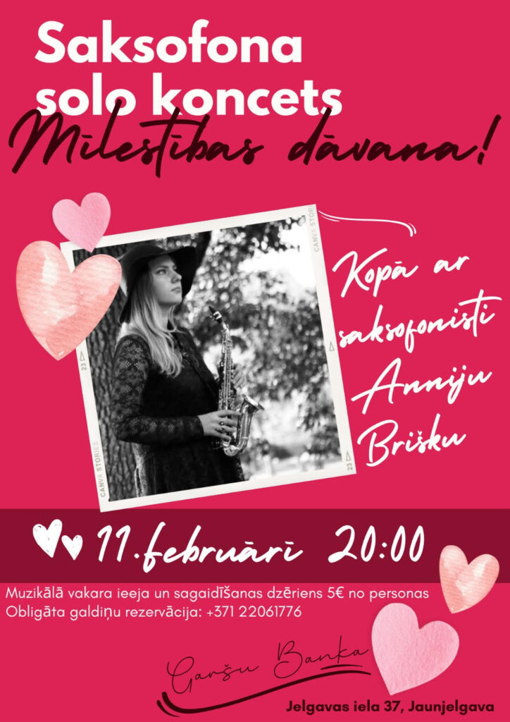 “Garšu banka” Jaunjelgavas centrā allaž ir jauka vieta, kur paēst un labi pavadīt laiku, bet, sagaidot visu mīlētāju svētkus Valentīndienu, 11. februārī tā aicina uz īpašu vakaru. Koncerts “Mīlestības dāvana!” kopā ar saksofonisti Anniju Brišku ļaus pārsteigt un iepriecināt savu otru pusīti, pavadot muzikālu vakaru kopā uz īpaši romantiskas nots.