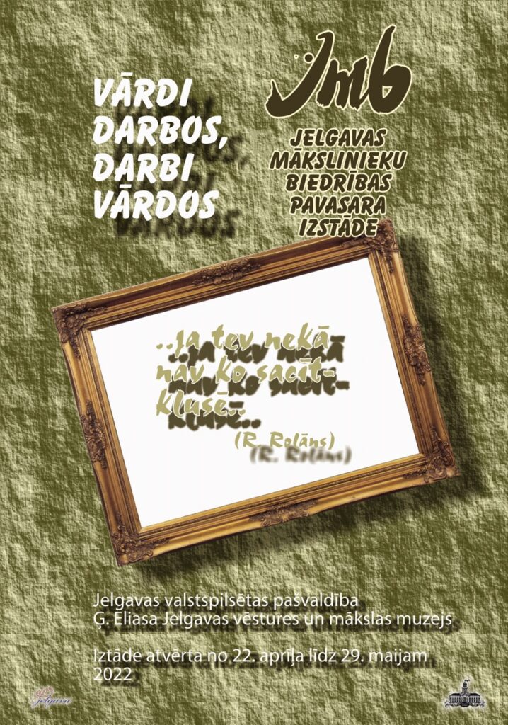 Jau kopš 22. aprīļa Ģederta Eliasa Jelgavas vēstures un mākslas muzejā skatāma Jelgavas mākslinieku biedrības dalībnieku darbu izstāde “Vārdi darbos, darbi vārdos”, kurā aplūkojamas dažādu paaudžu mākslinieku gleznas, grafikas, tekstīlijas, keramikas un stikla darbi, kā arī instalācijas u. c., informē muzeja sabiedrisko attiecību speciāliste Laura Stepiņa.