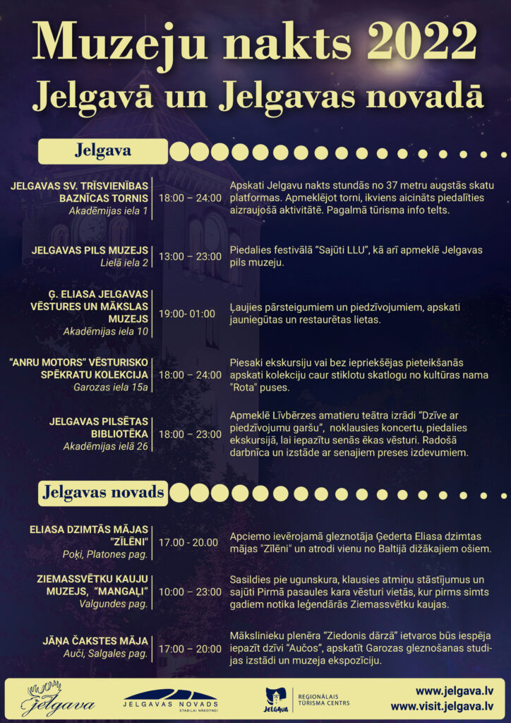 Sestdien, 14. maijā, Jelgavas kultūrvēsturiskie objekti vērs durvis apmeklētājiem, piedaloties Starptautiskajā akcijā “Eiropas Muzeju nakts”. Šogad Muzeju naktij nav vienotas tēmas, ļaujot akcijas dalībniekiem rādīt nozīmīgāko un interesantāko no saviem krājumiem, informē Jelgavas pašvaldības Sabiedrisko attiecību pārvaldē.