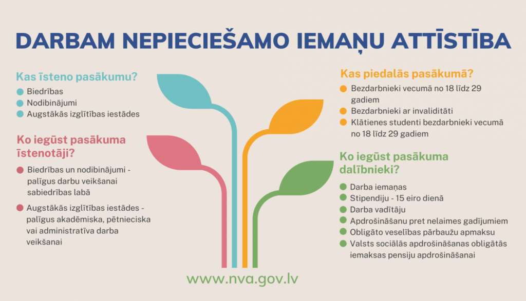 Pasākums “Darbam nepieciešamo iemaņu attīstība” tiek īstenots Eiropas Sociālā fonda projektā “Subsidētās darbavietas bezdarbniekiem”. 2021.gadā 639 bezdarbnieki iesaistīti pasākumā biedrībās un nodibinājumos, bet 66 studenti bezdarbnieki – augstākās izglītības iestādēs.