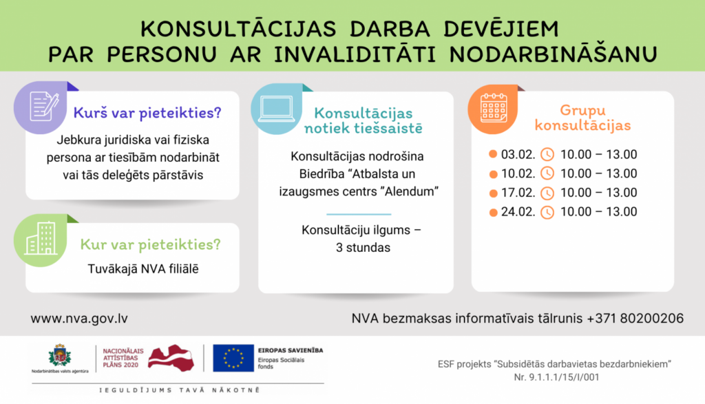 Darba devējiem, kuri nodarbina vai plāno nodarbināt darbiniekus ar invaliditāti, Nodarbinātības valsts aģentūra (NVA) februārī rīkos četras bezmaksas grupu konsultācijas par personu ar invaliditāti nodarbināšanas jautājumiem, informēja NVA.