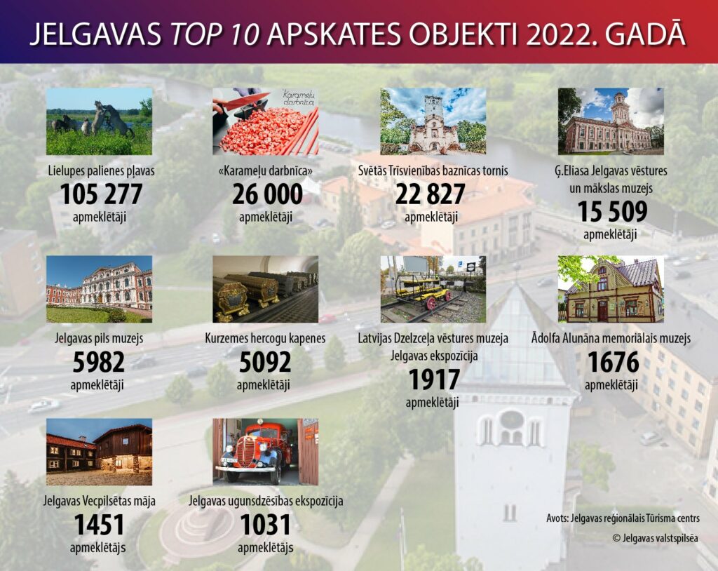 Apmeklētākais maksas apskates objekts 2022. gadā bija “Karameļu darbnīca”, kas uzņēma 26 000 viesu (2021. gadā – 5194). “Karameļu darbnīca” galvenokārt uzņem tūristu un skolēnu grupas, kam demonstrē karameļu gatavošanas noslēpumus un piedāvā degustācijas. Trešajā vietā ierindojas Jelgavas Svētās Trīsvienības baznīcas tornis ar 22 827 apmeklējuma reizēm. Salīdzinājumā ar iepriekšējo gadu skaits ir būtiski pieaudzis, proti, gadu iepriekš tornis apmeklēts 7293 reizes. Jāpiebilst, ka no 2022. gada februāra līdz jūlijam rekonstrukcijas dēļ nebija pieejamas torņa ekspozīcijas. Jaunizveidotās ekspozīcijas tika atklātas jūlijā, un pēc to atvēršanas tornī bija vērojams apmeklētāju pieplūdums. Tāpat līdz ar pandēmijas ierobežojumu atcelšanu pērn tornī aizvadīti vairāk pasākumu – trīs tūrisma vakari, piecas svinīgas mākslas darbu izstāžu atklāšanas, koncerts, 54 laulību ceremonijas, kā arī citi saviesīgi privāti pasākumi, kas kopumā pulcēja 2448 viesus.