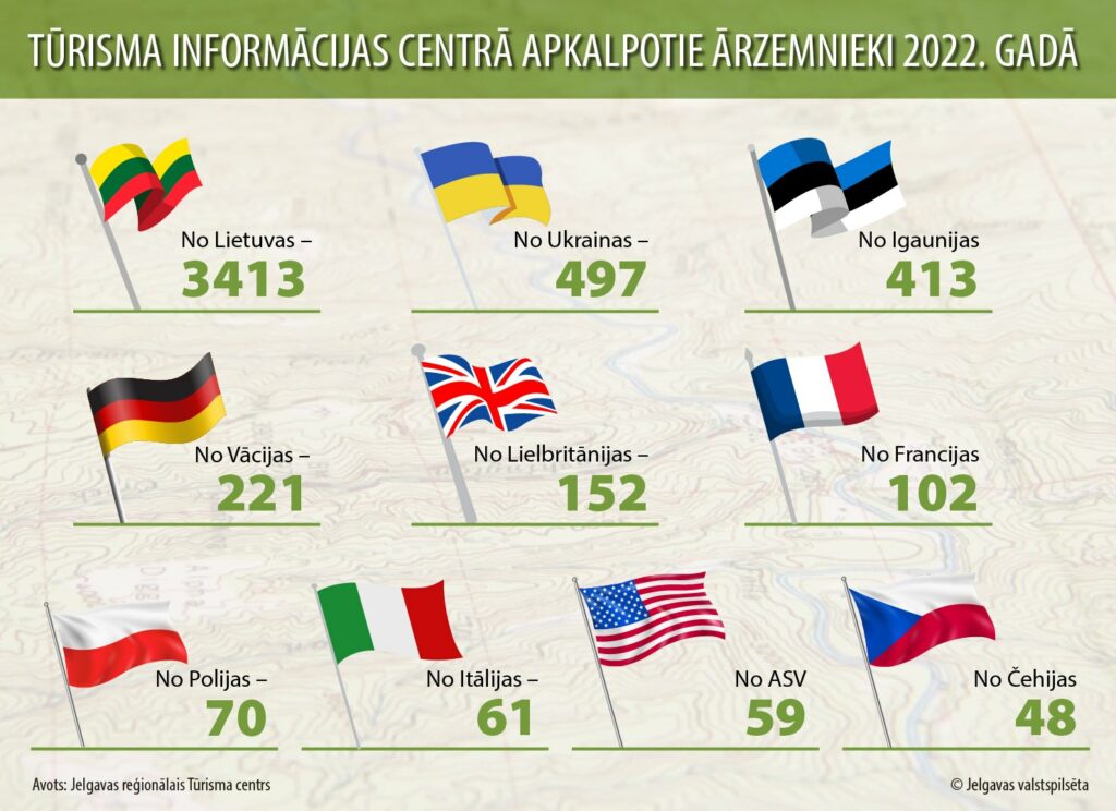 JRTC norāda, ka pagājušajā gadā salīdzinājumā ar 2021. gadu par 78 procentiem vairāk bijis ārvalstu ceļotāju, kuri vērsušies JRTC. Lielākais ārzemnieku tūristu īpatsvars bija no Lietuvas, Ukrainas, Igaunijas, Vācijas un Lielbritānijas. Savukārt vistālāko ceļu uz Jelgavu mērojuši tūristi no Filipīnu Republikas, Indonēzijas un Japānas. JRTC apmeklētāji galvenokārt interesējušies par apskates objektiem pilsētā un apkārtnē, ēdināšanu un pasākumiem, kā arī suvenīru iegādes vietām. Latvijas tūristu, kuri vērsušies JRTC, 2022. gadā bijis par 55 procentiem vairāk, bet jelgavnieku – par 56 procentiem. Tas liecina, ka vietējais tūrisms un ceļošana savas valsts robežās joprojām ir saistoša.