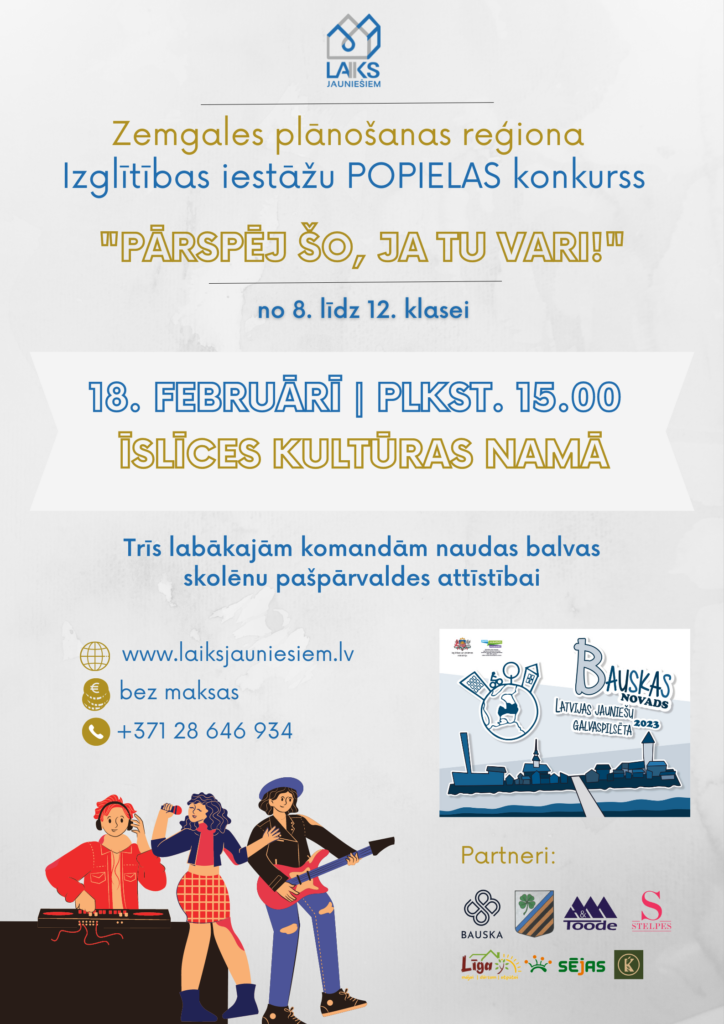 “Jaunieši ir mūsu tagadne – reģistrējies un iegūsti atbalstu savas izglītības iestādes aktivitāšu organizēšanā vai pašpārvaldes attīstībā. Gaidīsim Jūs visus ciemos: Bauskas novads – Latvijas jauniešu galvaspilsēta 2023!” uzsver konkursa rīkotājs.
