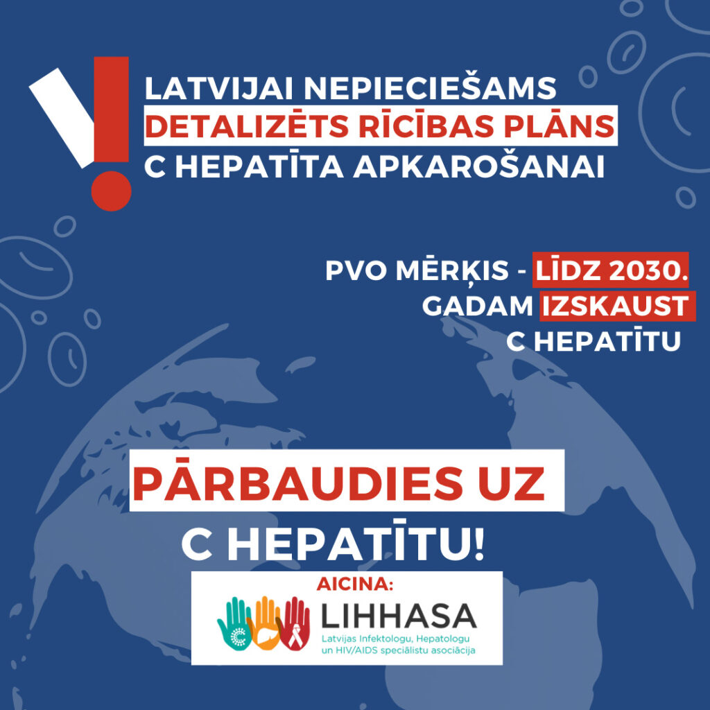 Pasaules hepatīta dienā, kura būs 28. jūlijā, Latvijas Infektologu, hepatologu un HIV/AIDS speciālistu asociācija (LIHHASA) īstenos informatīvo kampaņu “Pārbaudies uz C hepatītu!”, kuras gaitā aktīvāk uzsvērs plašākas testēšanas nepieciešamību Latvijā, kas ietver gan aktīvāku sabiedrības informēšanu, gan normatīvu pilnveidošanu, informē kampaņas rīkotāji.