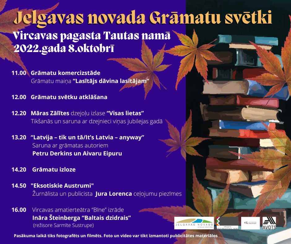 Vircavas Tautas namā 8. oktobrī notiks ikgadējie Grāmatu svētki, kuros grāmatu cienītāji varēs satikt rakstniekus un grāmatu autorus – Māru Zālīti, Aivaru Eipuru, Petru Derkinsu un Juri Lorencu. Pasākumā notiks arī grāmatu izloze un priecēs amatiermākslas kolektīvu uzstāšanās, informē Jelgavas novada pašvaldība.