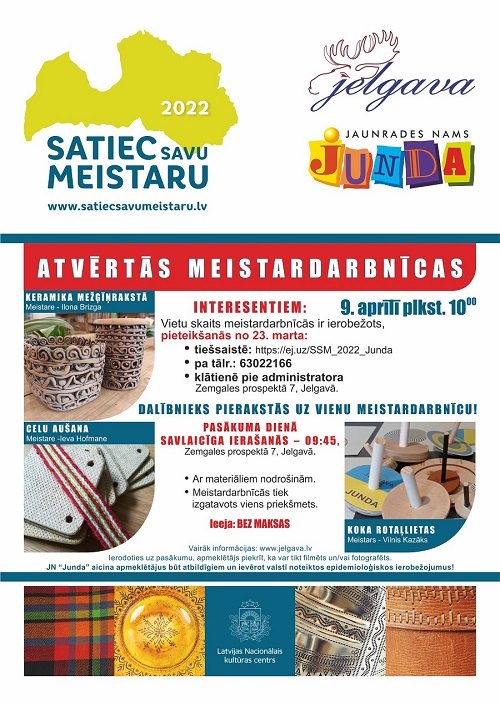 Nemateriālās kultūras vērtību saglabāšanas pasākums “Satiec savu meistaru 2022” Latvijā notiks jau 14. reizi,un šajā gadā – 9. aprīlī, to organizē Latvijas Nacionālās kultūras centrs. “Jundā” pasākums sāksies pulksten 10.