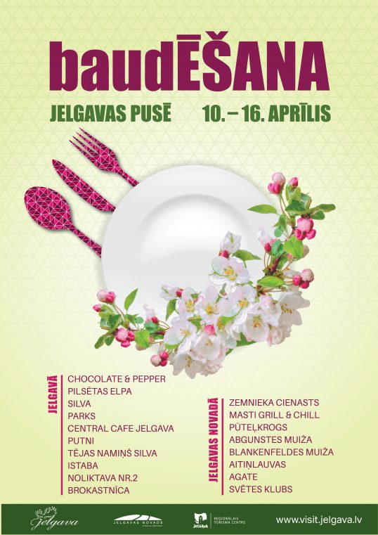 Jelgavā viesus laipni sagaidīs restorāni “Chocolate & Pepper”, “Pilsētas elpa”, “Parks”, “Central cafe”, krodziņš “Istaba”, bistro “Silva” un tējas namiņš “Silva”, Noliktava Nr.2, kafejnīca “Brokastnīca” un kūku bode “Putni”. Savukārt Jelgavas novadā ar “baudĒŠANAS” piedāvājumiem cienās restorāni “Pūteļkrogs”, “Agate”, “Aitiņlauvas”, restorāns – grilbārs “Masti Grill & Chill”, kafejnīca – restorāns “Zemnieka cienasts”, kafejnīca “Svētes klubs”, Blankenfeldes muiža un Abgunstes muiža. Jāpiebilst gan, ka Abgunstes muiža īpašu atmosfēru uzburs 12. un 14. aprīlī, Blankenfeldes muiža – 13. aprīlī, bet kūku bode “Putni” – no 10. līdz 14. aprīlim.