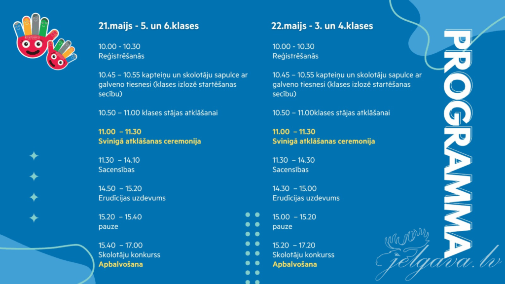 Trešdien, 21. maijā, sacentīsies vienpadsmit 5. klases un septiņas 6. klases, tostarp Jelgavas 4. vidusskolas 5.c un 6.c klase. Ceturtdien, 22. maijā, sacentīsies septiņpadsmit 3. klases un divpadsmit 3. klases, tostarp Jelgavas 4. vidusskolas 3.c un 4.a klase. Katra klašu grupa tiks vērtēta atsevišķi, nosakot sportiskāko 3., 4., 5., 6. klasi.