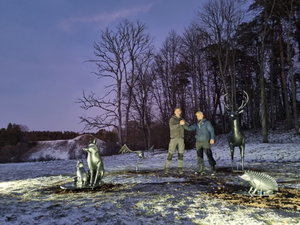 Skulptūras veidojuši metāla mākslinieki Artūrs Ozols un Aleksandrs Repins. “Katram autoram ir savs raksturs, Aleksandra Repina veidotās lapsu un brieža skulptūras ir reālistiskā manierē, bet ezi un dzērvi Artūrs Ozols darinājis pilnīgi citādāk, es teiktu, industriālā modernisma stilā. Katrā ziņā jāatbrauc un jāpaskatās! Aptuvenā oriģinālizmērā tapuši briedis un dzērve, bet ezis un lapsa ir stilizēti lielāki. Annas Brigaderes senatnīgums mijas ar modernu mākslu!” mākslinieku darbu komentē Tērvetes kultūras nama vadītāja.