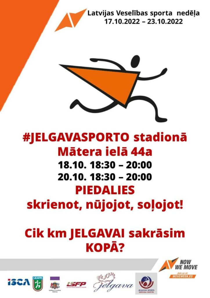 Jelgavā Latvijas Veselības sporta nedēļas aktivitātēs var iesaistīties ikviens interesents un stadionā pie Jelgavas sporta halles skriet, soļot vai nūjot. “Asociācija aicina katram sakrāt savu kilometru, kas Mātera ielas stadionā būtu trīs apļi. Bet katrs dalībnieks var veikt tik apļu, cik grib un spēj – galvenais ir piereģistrēt rezultātu,” skaidro Jelgavas pašvaldības iestādes “Sporta servisa centrs” direktora vietniece Maija Actiņa.