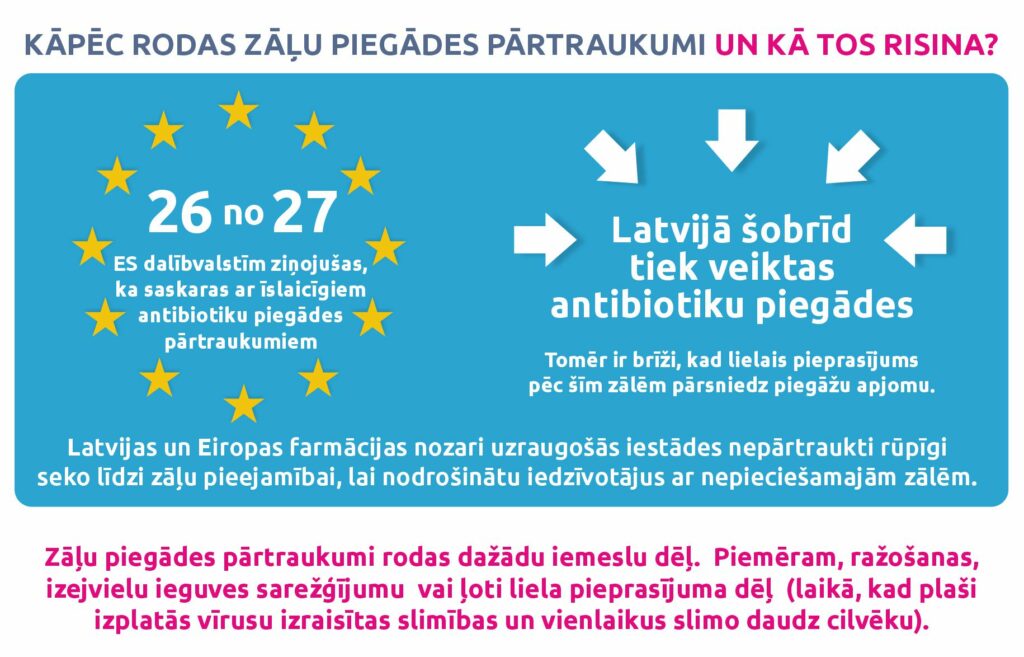 Zāļu valsts aģentūra (ZVA) informē, ka Eiropas Komisija un Eiropas zāļu aģentūru vadītāji (HMA), sadarbojoties Zāļu piegādes pārtraukumu un drošuma koordinācijas izpildgrupā (MSSG), seko līdzi un reaģē uz šī brīža antibiotiku piegādes pārtraukumiem Eiropas Savienībā (ES).