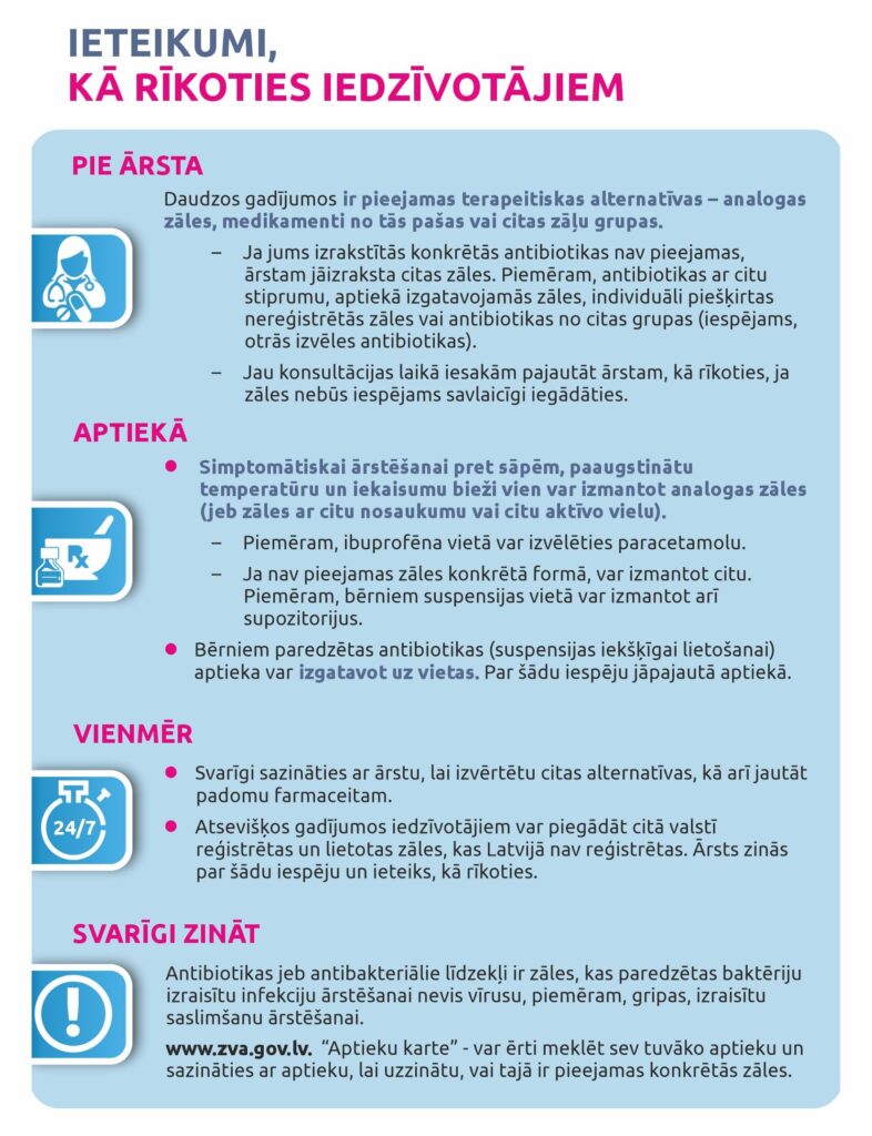Plašāka informācija par to, kā rīkoties šo zāļu nepieciešamības gadījumā: https://www.zva.gov.lv/lv/jaunumi-un-publikacijas/jaunumi/zalu-valsts-agentura-sniedz-informaciju-par-berniem-paredzetu-antibiotiku-un-ibuprofena-pieejamibu