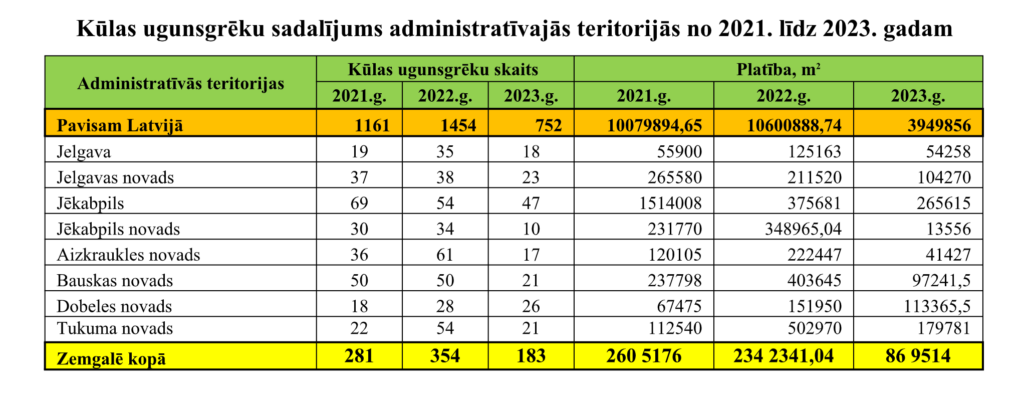 Aizvadītajā gadā kūlas ugunsgrēkos izdega 86,9 hektāri Zemgales teritorijas, kas ir trīs reizes mazāk nekā 2022. gadā, kad kūlas ugunsgrēkos izdega 234 hektāri teritorijas. No administratīvajām teritorijām lielākais kūlas ugunsgrēku skaits pērn reģistrēts Jēkabpilī (47), Dobeles novadā (26) un Jelgavas novadā (23).