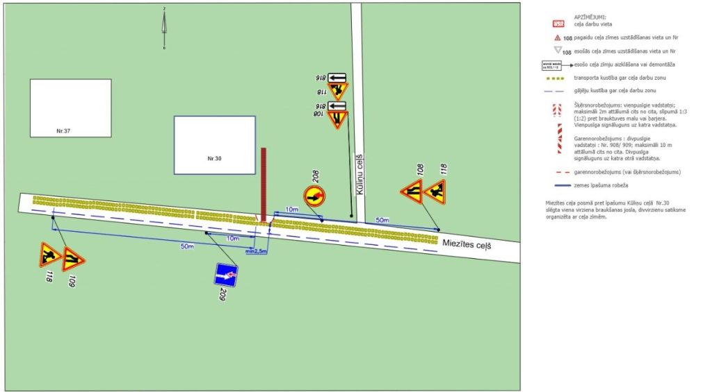 Ierobežojumi saistīt ar gāzesvada izbūvi īpašumam Kūliņu ceļā 30. Darbus veic un par satiksmes organizāciju objektā atbild SIA “MG Mītavas gāze”.
