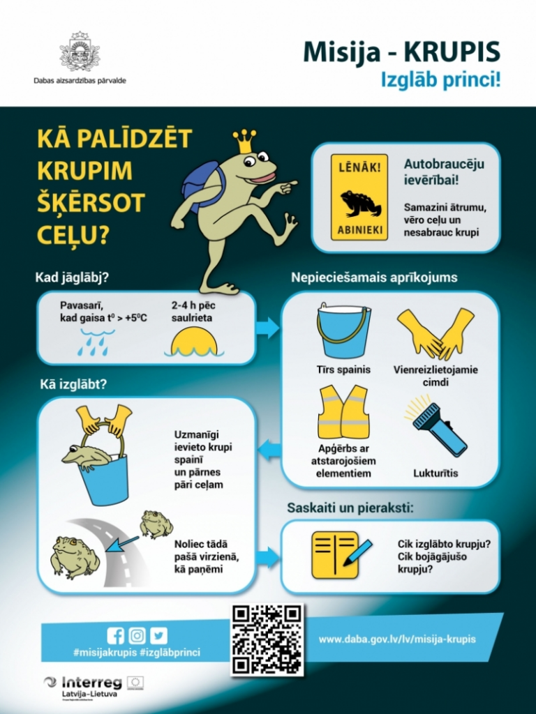 Lai uzsāktu ceļu uz dzimto dīķi, līdz ar silto un lietaino laiku modīsies krupji, kas ir lēni rāpotāji un ceļa šķērsošana tiem var aizņemt pat 15 minūtes, kas bieži intensīvās satiksmes dēļ beidzas neveiksmīgi. Lai saglabātu šo abinieku sugu, jau otro gadu Dabas aizsardzības pārvalde ikvienu aicina iesaistīties kampaņā “Misija – KRUPIS. Izglāb princi!”, kļūt par brīvprātīgo krupju glābēju un aktīvajā migrācijas laikā noteiktā ceļa posmā palīdzēt krupjiem droši šķērsot brauktuvi.