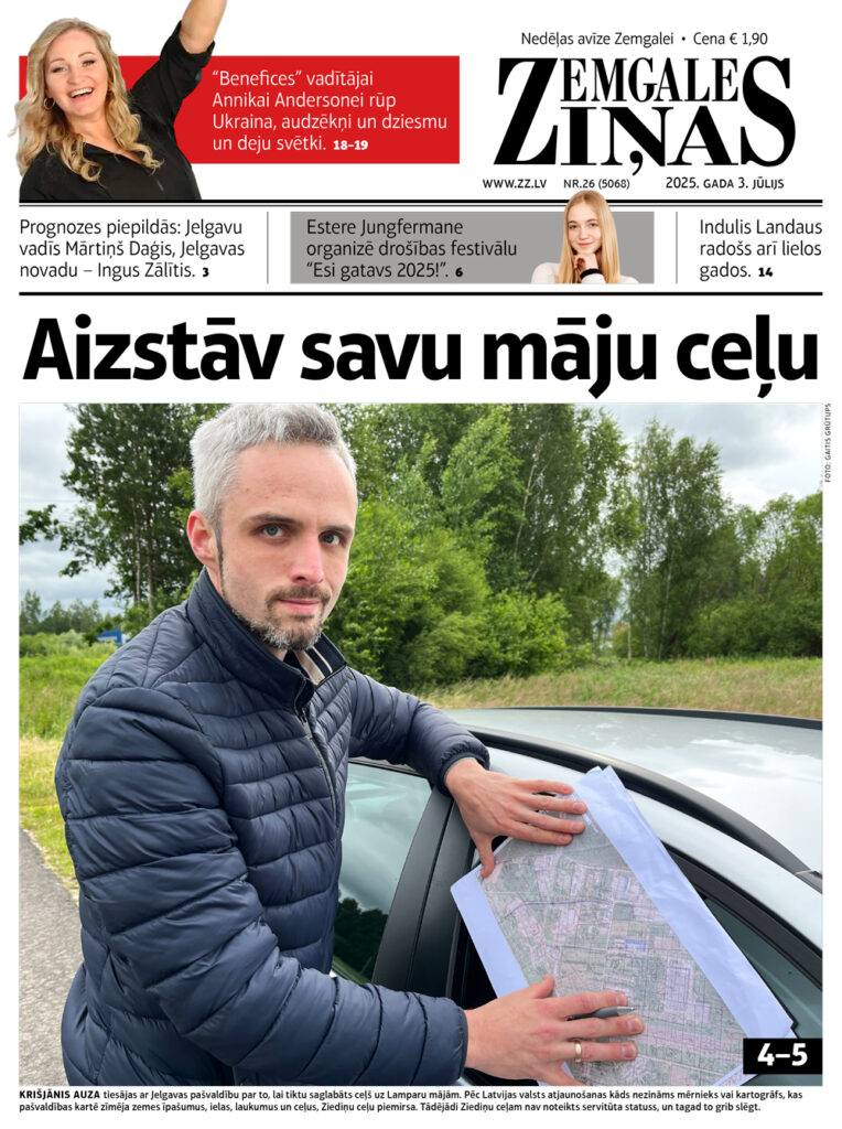 Jaunākajā laikraksta “Zemgales Ziņas” numurā (03.07.2025) lasiet: *Ziediņu ceļā tiesājas pret uzņēmēja plānu reprezentablā vietā izbūvēt atkritumu šķirotavu. *Prognozes piepildās: Jelgavu vadīs Mārtiņš Daģis, Jelgavas novadu – Ingus Zālītis. *Jaunākais, kas būtu jāzina darba devējiem. *Pensionārei par dzīvesbiedra noduršanu piespriež cietumsodu. *Deju skolas “Benefice” izrāde “Київ–Rīga” atklāj bērnu pieredzi kara ēnā.