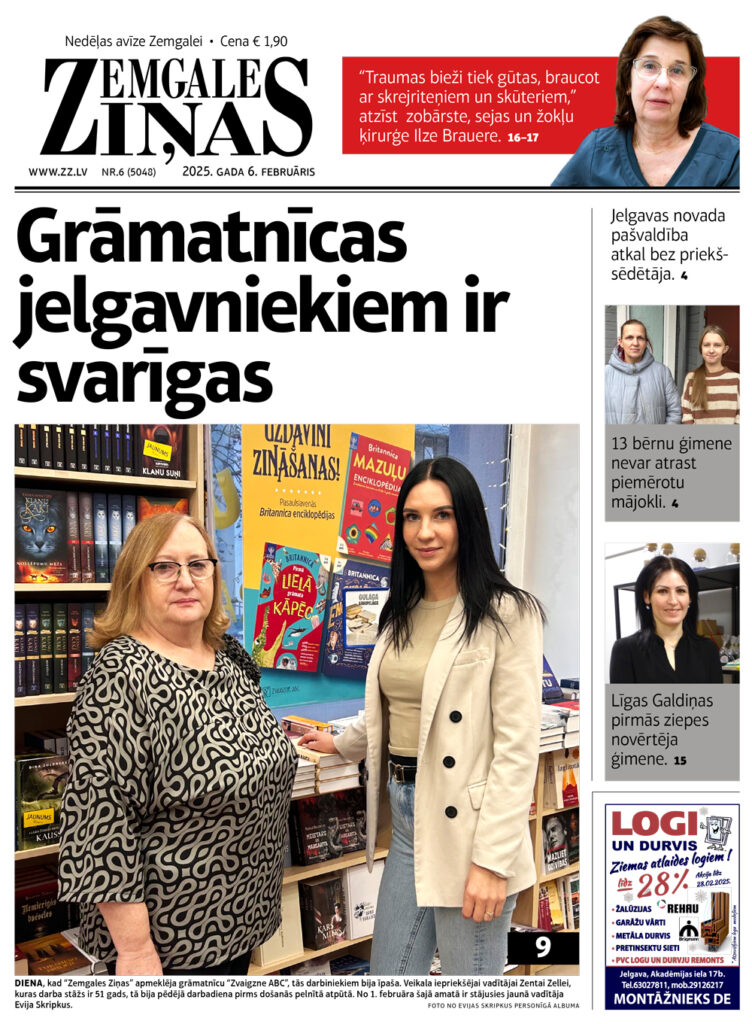 Jaunākajā laikraksta “Zemgales Ziņas” numurā (06.02.2025) lasiet: *Jelgavas novada pašvaldība atkal bez priekšsēdētāja. *Tiesa attaisno zirga novārdzināšanā apsūdzēto salgalieti. *Grāmatnīcas jelgavniekiem ir svarīgas. *Līgas Galdiņas pirmās ziepes novērtēja ģimene. *Atklāts rakstu krājums “Latvijas vēsturiskā zeme Zemgale”.