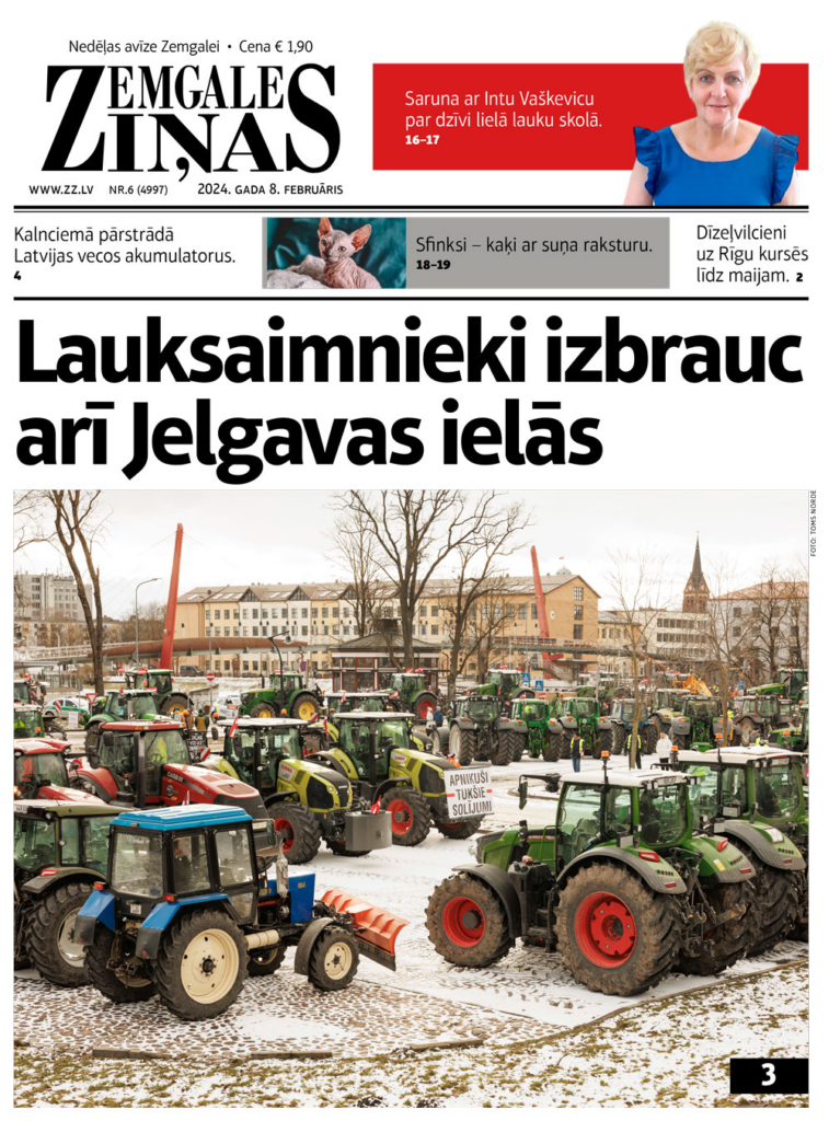 Lasi vēl:*Sfinksi – kaķi ar suņa raksturu.*Gadu mijas ceļojums uz Ukrainu.*Meteņdienas svinības.*Dīzeļvilcieni uz Rīgu kursēs līdz maijam.*Lauksaimnieki izbrauc arī Jelgavas ielās.*Veikalu apzadzēju aprindās jauns rekordists.