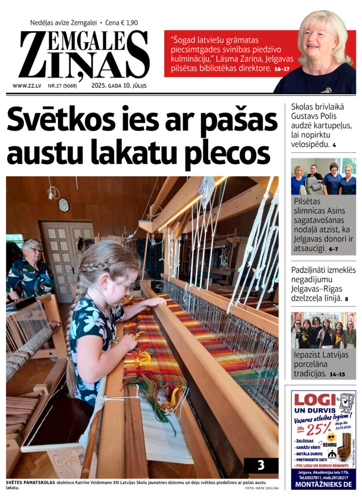 Jaunākajā laikraksta “Zemgales Ziņas” numurā (10.07.2025) lasiet: *Padziļināti izmeklēs negadījumu Jelgavas–Rīgas dzelzceļa līnijā. *Svētes pamatskolas skolniece dodas uz Dziesmu un deju svētkiem ar pašas austu lakatu. *Laimīga dzīve ir dzīve mūzikā. Diriģents Jānis Zirnis. *Dzīve pierobežā: no Birzgaļiem līdz Pograničai. *“Šogad latviešu grāmatas piecsimtgades svinības piedzīvo kulmināciju,” Lāsma Zariņa, Jelgavas pilsētas bibliotēkas direktore. *Pilsētas slimnīcas Asins sagatavošanas nodaļā atzīst, ka Jelgavas donori ir atsaucīgi.