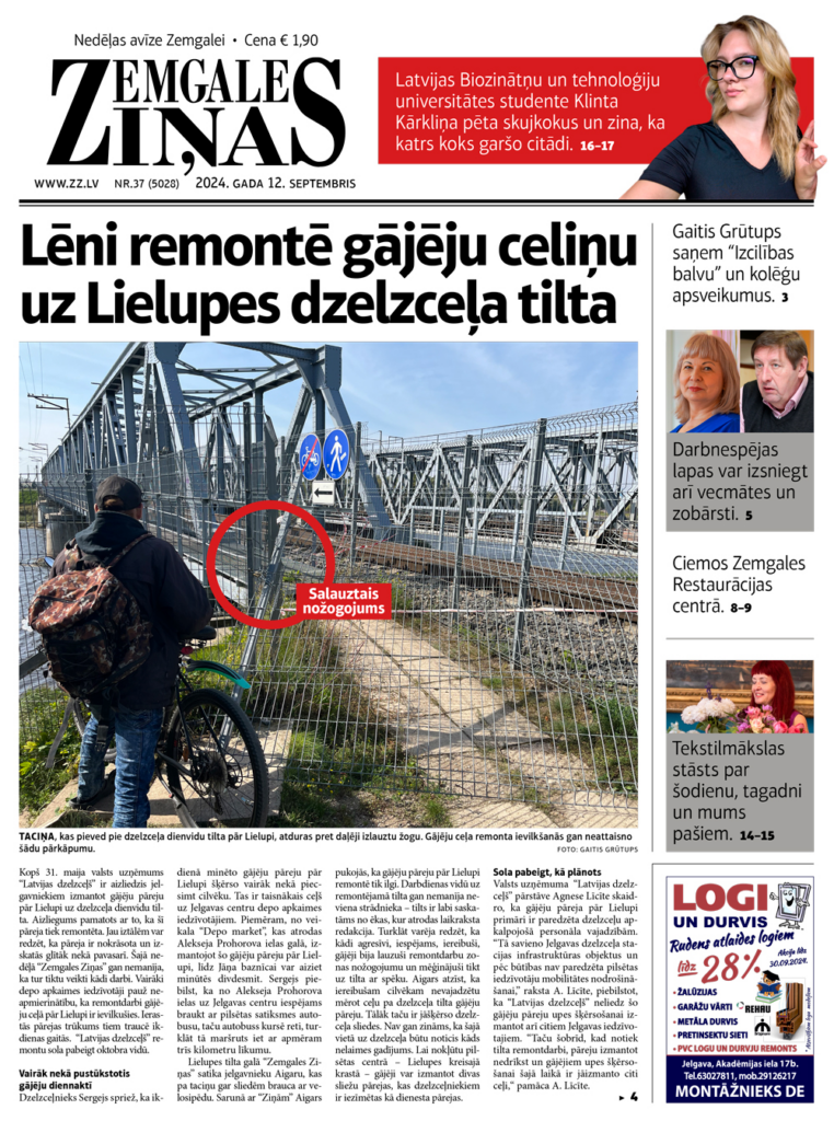 Jaunākajā laikraksta “Zemgales Ziņas” numurā (12.09.2024) lasiet: *Lēni remontē gājēju celiņu uz Lielupes dzelzceļa tilta. *Dzērājšoferis aiztiesājas līdz pat Senātam. *Ciemos Zemgales Restaurācijas centrā. *Eliasa muzejā tekstilmākslas stāsts par šodienu, tagadni un mums pašiem. *Latvijas Biozinātņu un tehnoloģiju universitātes studente Klinta Kārkliņa pēta skujkokus un zina, ka katrs koks garšo citādi.