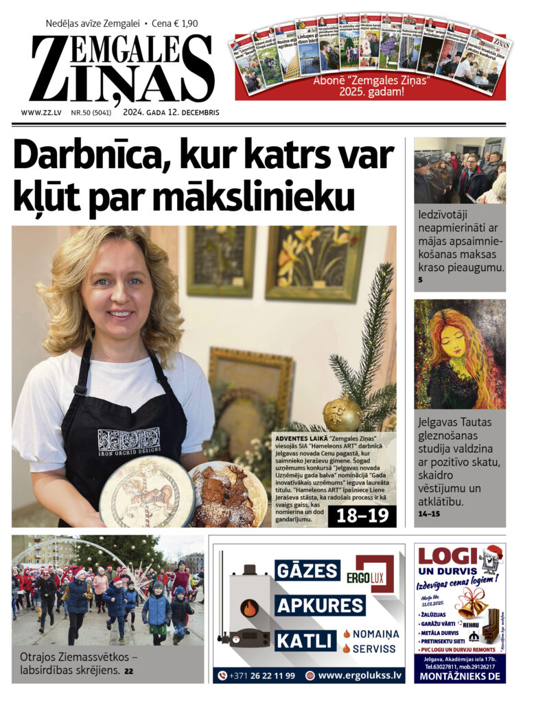 Jaunākajā laikraksta “Zemgales Ziņas” numurā (12.12.2024) lasiet: *Iedzīvotāji neapmierināti ar mājas apsaimniekošanas maksas kraso pieaugumu. *Kolaborācija: kad vēsturnieki patiesību nemeklē, tad uzplaukst vientiesība. *Jelgavas Tautas gleznošanas studija valdzina ar pozitīvo skatu, skaidro vēstījumu un atklātību. *Vita Anstrate: “Pirmais un galvenais ir cilvēka attieksme!” *Darbnīca, kur katrs var kļūt par mākslinieku.