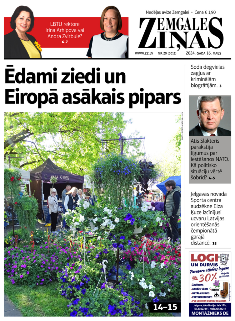 Jaunākajā laikraksta “Zemgales Ziņas” numurā (16.05.2024) lasiet: *LBTU uz rektora amatu pretendē Irina Arhipova un Andra Zvirbule. *Atis Slakteris parakstīja līgumus par iestāšanos NATO. Kā politisko situāciju vērtē šobrīd? *Stādu dienās – ēdami ziedi un Eiropā asākais pipars. *Rundāles pils franču dārzā zied plašā sīpolpuķu kolekcija.
