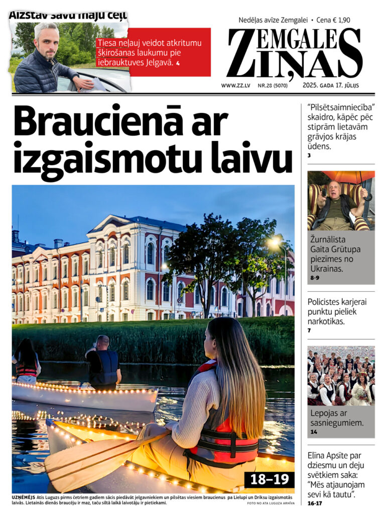 Jaunākajā laikraksta “Zemgales Ziņas” numurā (17.07.2025) lasiet: *Tiesa neļauj veidot atkritumu šķirošanas laukumu pie iebrauktuves Jelgavā. *Policistes karjerai punktu pieliek narkotikas. *Liepziedu smaržu Ļvivā elpojot: žurnālista Gaita Grūtupa piezīmes no Ukrainas. *Elīna Apsīte par dziesmu un deju svētkiem saka: “Mēs atjaunojam sevi kā tautu”. *Lielvircavas muiža – vieta ar mājas sajūtu. *Braucienā ar izgaismotu laivu. *Viduslaiku sajūtas Hohenverfenas cietoksnī.