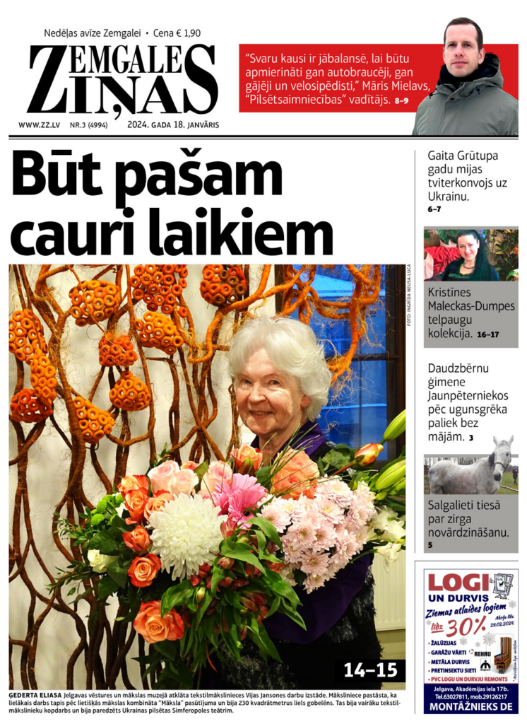 Jaunākajā laikraksta “Zemgales Ziņas” numurā (18.01.2024) lasiet:*Daudzbērnu ģimene Jaunpēterniekos pēc ugunsgrēka paliek bez mājām.*Gaita Grūtupa gadu mijas tviterkonvojs uz Ukrainu.*Kristīnes Maleckas-Dumpes telpaugu kolekcija.*Salgalieti tiesā par zirga novārdzināšanu.*Atklāta mākslinieces Vijas Jansones personālizstāde “Palikt pašam”.