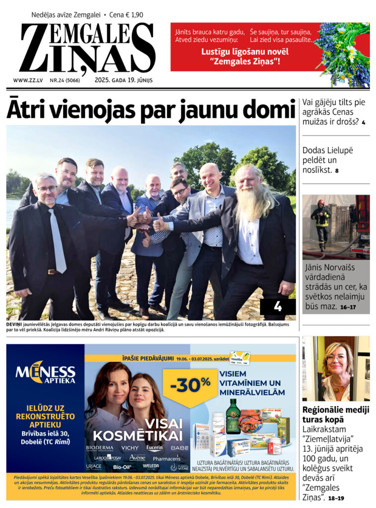 Jaunākajā laikraksta “Zemgales Ziņas” numurā (19.06.2025) lasiet: *Jelgavā domes vadībā virza Mārtiņu Daģi, Jelgavas novadā – Ingu Zālīti. *Reģionālie mediji turas kopā: laikraksta “Ziemeļlatvija” 100 gadu jubilejas svinības. *Jānis Norvaišs vārdadienā strādās un cer, ka svētkos nelaimju būs maz. *Vai gājēju tilts pie agrākās Cenas muižas ir drošs?