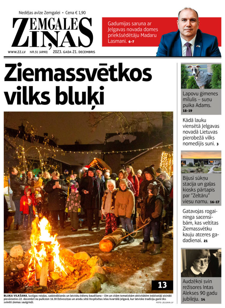 Jaunākajā laikraksta “Zemgales Ziņas” numurā (21.12.2023) lasiet: *Kūku konkurss “Ziemas sapnis”.*Gadumijas saruna ar Jelgavas novada domes priekšsēdētāju Madaru Lasmani.*Audzēkņi svin režisores Intas Alekses 90 gadu jubileju.*Bijusī sūkņu stacija un gaļas kiosks pārtapis par “Zeltāru” viesu namu.*Lapovu ģimenes mīlulis – suņu puika Adams.