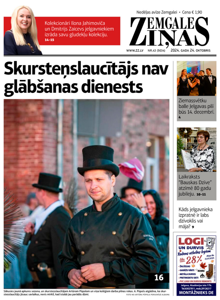Jaunākajā laikraksta “Zemgales Ziņas” numurā (24.10.2024) lasiet: *Jelgavā plūdus mazinās ar kolektoru jaudu palielināšanu. *Laikraksts “Bauskas Dzīve” atzīmē 80 gadu jubileju. *Kāds jelgavnieka izpratnē ir labs dzīvoklis vai māja? *Kolekcionāri Ilona Jahimoviča un Dmitrijs Zaicevs jelgavniekiem izrāda savu gludekļu kolekciju. *Skursteņslaucītājs nav glābšanas dienests.