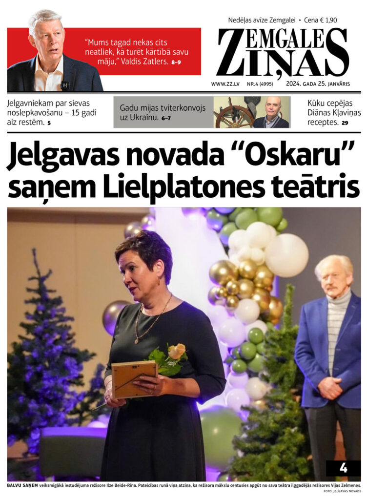 Jaunākajā laikraksta “Zemgales Ziņas” numurā (25.01.2024) lasiet:*Jelgavas novada “Oskaru” saņem Lielplatones teātris.*Par sievas noslepkavošanu – 15 gadi aiz restēm.*Gadu mijas ceļojums uz Ukrainu.*Diānai Kļaviņai kūku cepšana ierakstīta zvaigznēs.*Dabas simboli 2024. gadā.