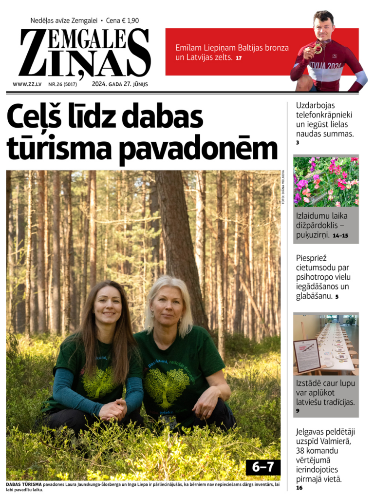 Jaunākajā laikraksta “Zemgales Ziņas” numurā (27.06.2024) lasiet: *Par četrām tabletēm četri mēneši aiz restēm. *Ceļš no pārgājienu organizēšanas līdz nometnēm mežā. *Izlaidumu laika dižpārdoklis – puķuzirņi. *“Balticovo” solāro paneļu parkā zāli noēd aitas. *Jelgavas peldētāji uzspīd Valmierā, 38 komandu vērtējumā ierindojoties pirmajā vietā.