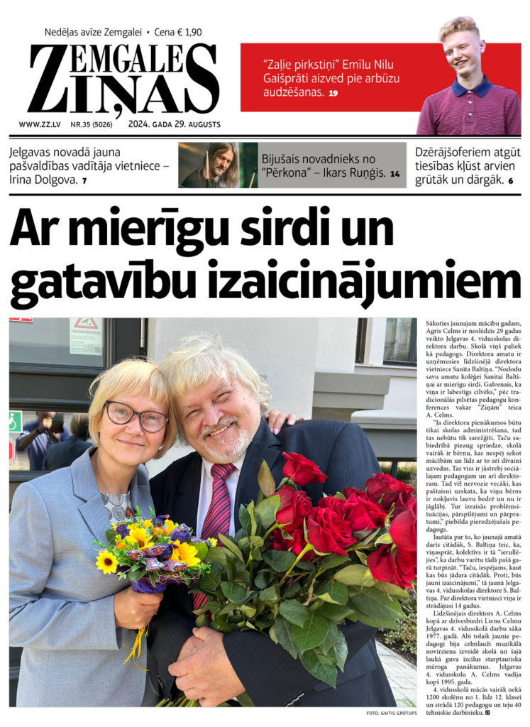 Jaunākajā laikraksta “Zemgales Ziņas” numurā (29.08.2024) lasiet: *Jelgavas novadā jauna pašvaldības vadītāja vietniece – Irina Dolgova. *Bijušais novadnieks no “Pērkona” – Ikars Ruņģis. *Dzērājšoferiem atgūt tiesības kļūst arvien grūtāk un dārgāk. *“Zaļie pirkstiņi” Emīlu Nilu Gaišprāti aizved pie arbūzu audzēšanas. *Zaļenieku erudīti tuvāk iepazīst kaimiņus.