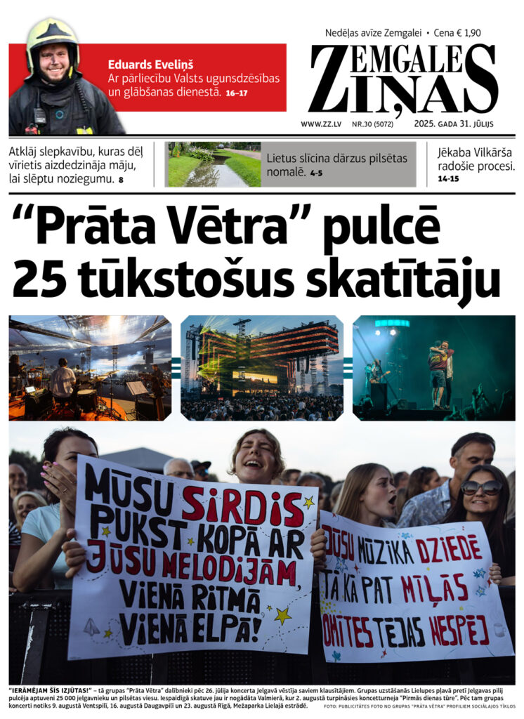 Jaunākajā laikraksta “Zemgales Ziņas” numurā (31.07.2025) lasiet: *Liepziedu smaržu Ļvivā elpojot: žurnālista Gaita Grūtupa piezīmes no Ukrainas. Turpinājums. *Saruna ar Jēkabu Vilkārsi. *Pārsteidzošs daiļdārzs Valles pagastā. *Saruna ar VUGD Zemgales reģiona pārvaldes Dobeles daļas vada komandieri Eduardu Eveliņu.