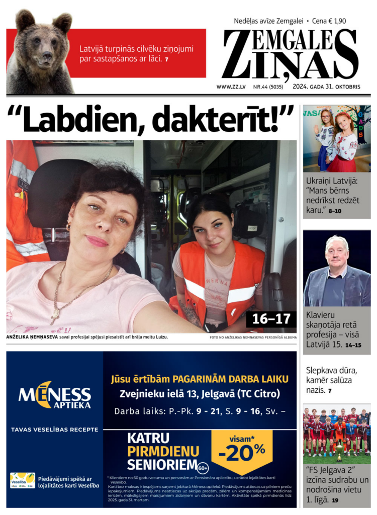 Jaunākajā laikraksta “Zemgales Ziņas” numurā (31.10.2024) lasiet: *Slepkava dūra, kamēr salūza nazis. *Latvijā turpinās cilvēku ziņojumi par sastapšanos ar lāci. *Kā Latvijā iedzīvojušies un jūtas kara plosītās Ukrainas bēgļi. *Klavieru skaņotāja retā profesija – visā Latvijā 15. *Saruna ar neatliekamās medicīnas ārsta palīdzi Anželiku Ņemņasevu.